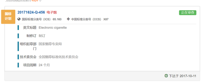 记者查询国家标准化管理委员会官方网站发现,于2017年10月下达的电子烟国家标准制定计划,项目进度要经过网上公示、起草、征求意见、审查、批准、发布几个阶段。但此项目自2019年6月开始至今,状态一直呈:“正在批准”。