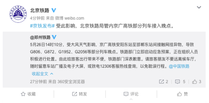 接触挂网异物影响 北京铁路局管内京广高铁部分列车接入晚点