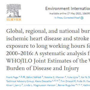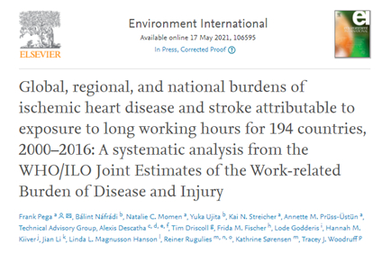 2021年5月17日,世界卫生组织(WHO)、国际劳工组织(ILO)和美国加州大学旧金山分校等国际研究机构在《Environment International》上发表了世界范围内首份关于过劳对健康影响的报告。他们分析了全球近200个国家或地区的相关数据,发现过劳导致全球每年74.5万人死亡。而且这一问题正变得越来越严重。①