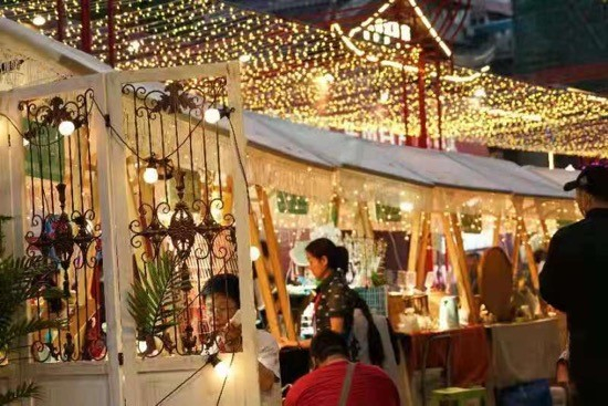 夜幕降临,在古风雅韵的弦乐表演中,从府南河音乐广场到九眼桥酒吧一条街华灯绽放,一个一个集市摊位承载着非遗手作、国风DIY等特色文创产品亮相街头。