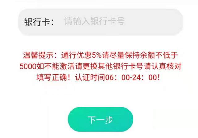 把弹窗关闭后,就进行输入车牌号及绑定银行卡阶段,在绑定银行卡阶段,会有一个“请尽量保持余额不低于5000元,如不能激活请更换其他银行卡号”的提示。