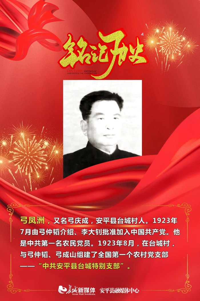 长城网讯(记者 邢梅智 通讯员 崔颖迅)1923年,从安平县(今属河北省衡水市)滹沱河岸边的台城村走出去的青年弓仲韬,在李大钊领导下,返回家乡建立了全国第一个农村党支部——中共台城特别支部,点燃了推翻旧世界、创造新世界的星星之火。1924年,弓仲韬又主持成立了党在河北的第一个县委——中共安平县委。从此,中国农村第一面党旗在这里高高飘扬,革命火种开始在安平大地播撒,并以燎原之势向冀中一带乃至全国燃烧蔓延。