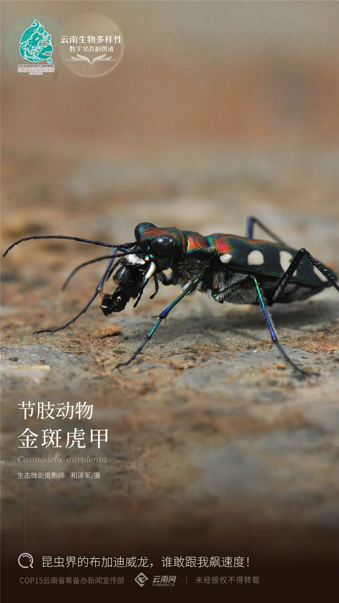 原标题:【云南生物多样性数字化百科图谱】金斑虎甲:昆虫界的布加迪威龙,谁敢跟我飙速度!