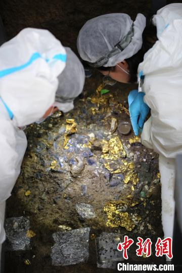 三星堆遗址5号祭祀坑黄金大面具发掘现场。 雷雨 摄