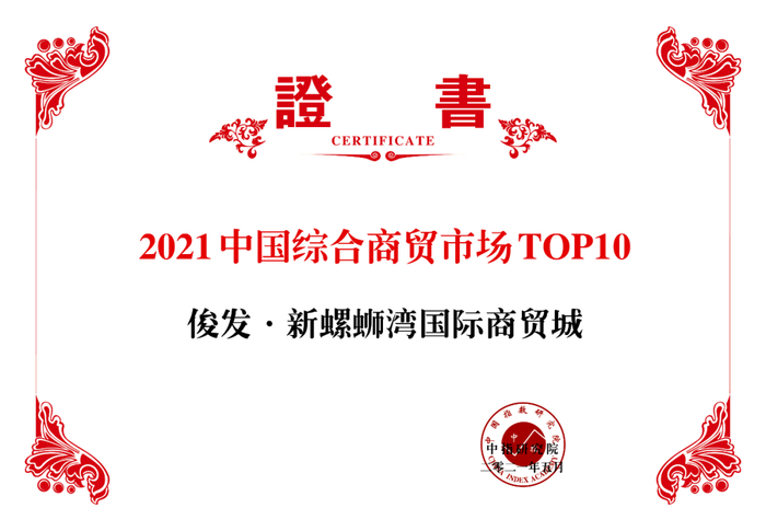 在本次研究中,俊发·新螺蛳湾国际商贸城荣膺“2021中国综合商贸市场TOP10”,位列第三名。
