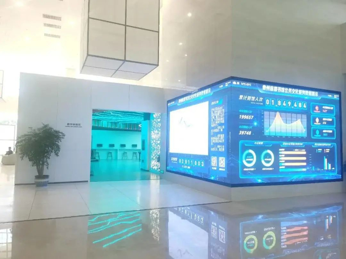 数字体验区:读者入馆首先会进入到数字体验区范围,本区域以贵州数字图书馆海量的数字资源为基础,通过多样化的高新技术手段,生动、有趣、科学地集中展示贵州省图书馆已有的数字服务和浩瀚资源,提供数字资源阅读、互动体验、大数据展示、机器人服务、特色数字资源服务、VR虚拟阅读站、寄语触摸屏、光影流书墙、智能书法台等前沿科技互动,大大增强了读者的综合性互动体验。