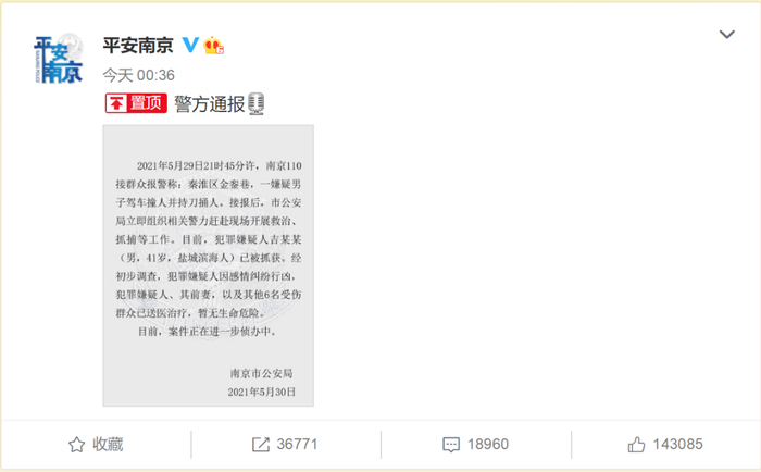 29日21时45分许,南京110接群众报警称,秦淮区金銮巷有一嫌疑男子驾车撞人并持刀捅人。接报后,南京市公安局立即组织相关警力赶赴现场开展救治、抓捕等工作。目前,犯罪嫌疑人吉某某(男,41 岁,盐城滨海人)已被抓获。