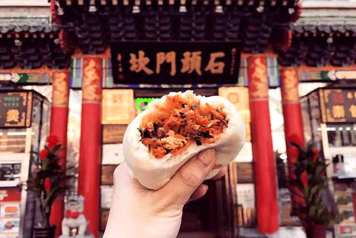 石头门坎素包已有百余年的历史。其以绿豆芽菜、粉皮、香干等调拌成馅,用精面粉作皮,蒸熟而成。石头门坎素包具有浓郁的地方风味,是天津传统风味小吃。晚清时代,由于天津地处华北五大河流汇合点,濒临渤海湾,自古以来航运发达。当时这一地区居住着众多以捕鱼为生的渔民。这些渔民和他们的家属为了祈求海神保佑,常去天后宫敬香请愿,他们根据佛教不杀生食素斋的佛门戒律,吃素斋行善事,于是就在天津东北角附近的海河边“天后宫”宫南大街对面的一条小巷内开业了一家最早经营天津素食的餐馆“真素园佛素包”。石头门坎素包始于清代,由天津真素园经营,向以选料多样,清素不腻,制作讲究,深为广大群众所喜爱。该店临近海河,为防洪水,店外设矮堤,形似门坎,市人便将此包称为“石头门坎素包”。