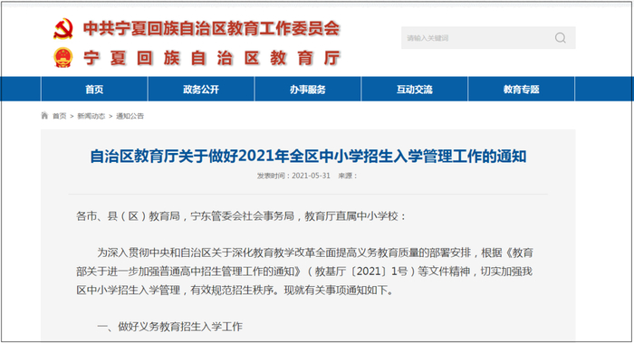 原标题:宁夏家长必看!2021年中小学招生安排来了!