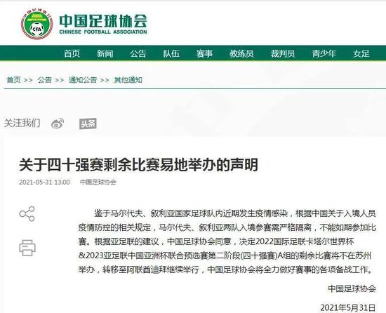 据中国足球协会,鉴于马尔代夫、叙利亚国家足球队内近期发生疫情感染,根据亚足联的建议,中国足球协会同意,决定2022国际足联卡塔尔世界杯&2023亚足联中国亚洲杯联合预选赛第二阶段(四十强赛)A组的剩余比赛将不在苏州举办,转移至阿联酋迪拜继续举行,中国足球协会将全力做好赛事的各项备战工作。