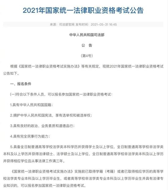 5月31日,司法部发布2021年国家统一法律职业资格考试公告,明确客观题考试网上报名时间为6月10日至6月24日,考试时间为9月11日、12日;主观题考试时间为10月17日。