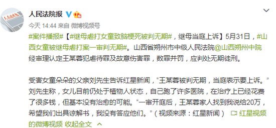 5月31日,山西12岁女童被继母虐打致脑梗死案在朔州中院一审开庭宣判。判决书显示,被告人王某蓉犯虐待罪判2年有期徒刑,犯故意伤害罪判无期徒刑;数罪并罚,决定执行无期徒刑。被告人赔偿附带民事诉讼原告人朵朵各项经济损失128万余元。受害女童朵朵的父亲刘先生称:“王某蓉被判无期,当庭表示要上诉。”刘先生称,女儿目前仍处于植物人状态,自己跑了许多医院,在治疗上已经花费了很多钱,但基本没有治愈的可能。2020年5月14日,12岁女孩朵朵因头部严重受伤昏迷,被送进大同市第三人民医院抢救。2020年5月17日,王某蓉因涉嫌虐待儿童罪,被怀仁市公安局采取刑事强制措施。
