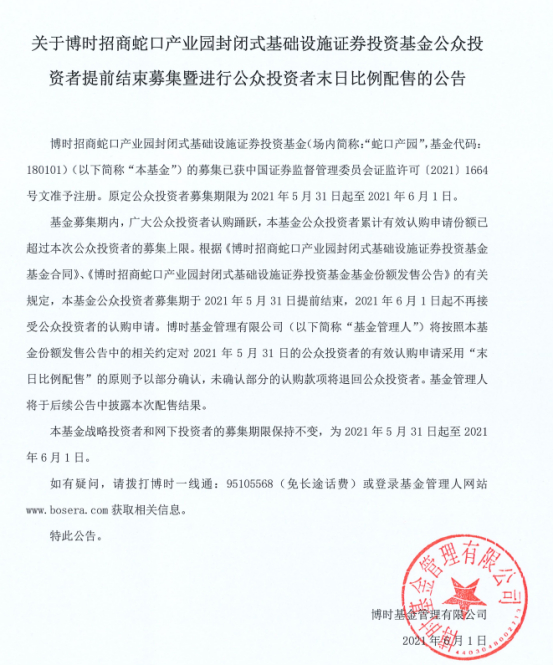 5月31日晚间博时基金的公告显示,博时招商蛇口产业园REIT原定募集期限为2021年5月31日至6月1日,由于投资者认购踊跃,该基金公众投资者累计有效认购申请份额已超过本次公众投资者的募集上限。该基金的公众投资者募集期于5月31日提前结束,并采取“末日比例配售”。