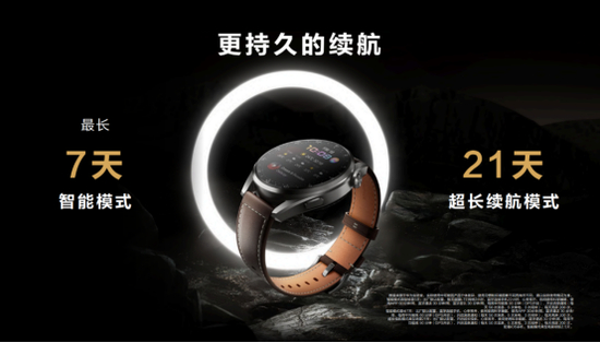 华为WATCH 3系列采用双芯架构,根据用户实际使用情况更大程度地节省功耗。智能典型模式下,华为WATCH 3和华为WATCH 3 Pro分别支持3天和5天长续航,超长续航模式下,更是分别支持14天和21天长续航,保证用户可以全天候佩戴、连续使用。 (华为实验室数据)