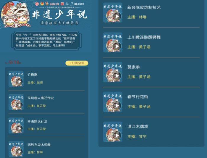 据介绍,参与录制本期音频特辑的少年们,由“非遗少年说”广东非物质文化遗产青少年演讲展示活动遴选而出。今年是该演讲展示活动的第二届,活动由广东省文化和旅游厅、广东省教育厅、共青团广东省委员会、少先队广东省工作委员会等单位指导。