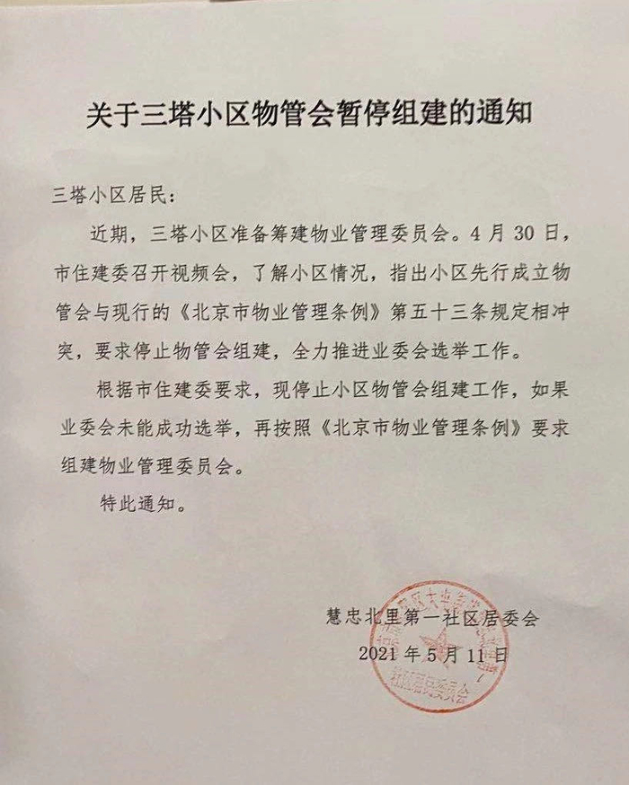 带着这样的困惑,小区业主咨询了北京市住建委,很快得到了回应。记者在小区宣传栏里看到一张5月11日公布的《关于小区物管会暂停组建的通知》,上面显示北京市住建委召开视频会了解了小区情况,指出小区先行成立物管会与现行的《北京市物业管理条例》第五十三条规定相冲突,要求停止物管会组建,全力推进业委会选举工作。根据市住建委要求,属地停止了物管会的组建工作,并表示如果业委会未能成功选举,再按照《北京市物业管理条例》要求组建物管会。