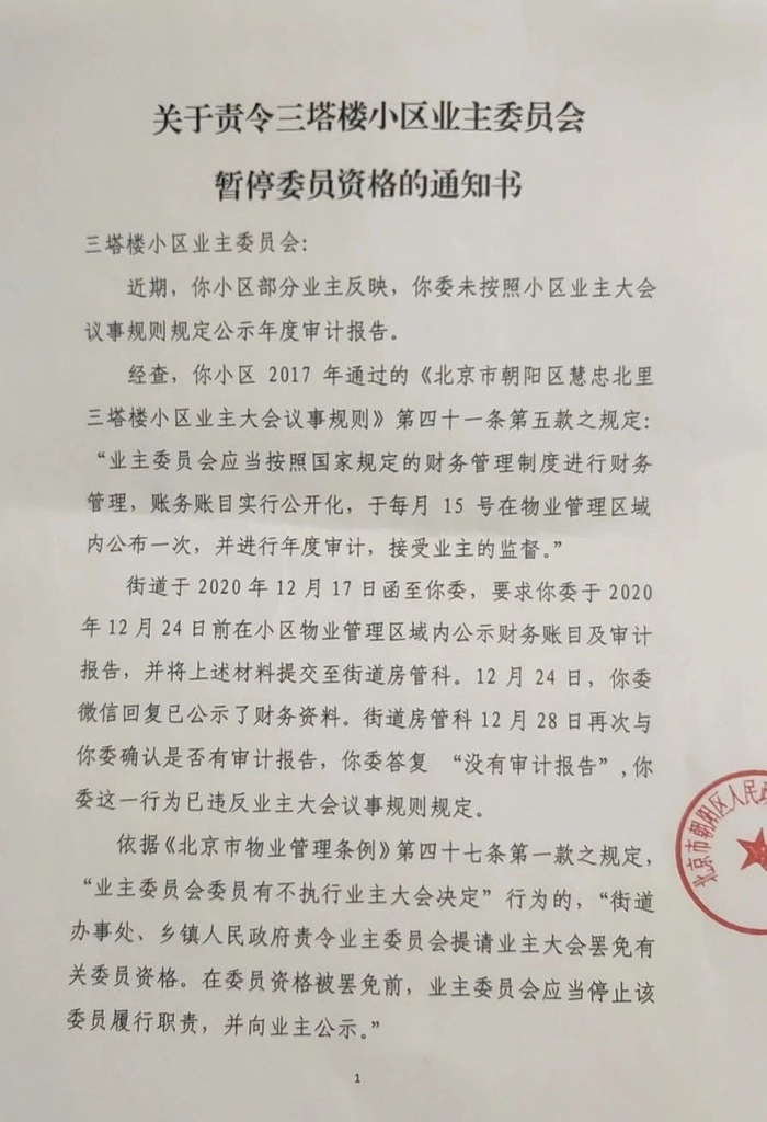 记者从大屯街道慧忠北里第一社区官方微信公众号查到,今年1月份,属地街道向业委会下发了一则通知:由于业委会没有公示年度审计报告,违反了相关规定,街道责令业委会停止任期内全部委员职责,并将任期内形成的全部材料移交属地社区暂时保管。
