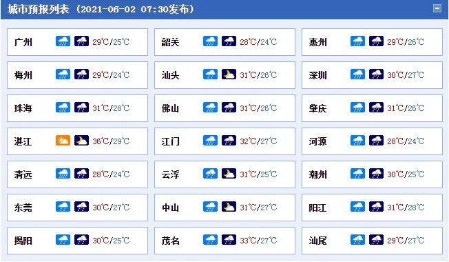 6月2日,韶关、清远、珠江三角洲北部市县和江门、阳江有大雨局部暴雨到大暴雨,其余市县有雷阵雨局部大雨到暴雨。