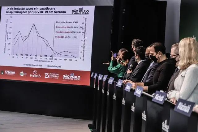 巴西圣保罗州政府5月31日在该州布坦坦研究所举行新闻发布会,公布该州塞拉纳市全面接种中国科兴公司克尔来福新冠疫苗的试验结果。结果显示,与试验开始之初的数据相比,全面接种完成后,当地新增有症状新冠病例数下降80%,住院人数下降86%,新增死亡病例数下降95%。