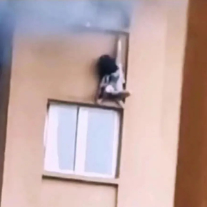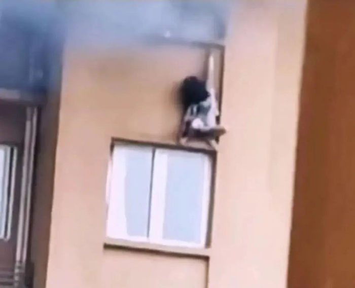 视频来看现场火势凶猛,滚滚浓烟从窗口窜出,不时有物品往下掉落。一名女子试图爬到窗外避险,她双手抓住自家窗户边沿上,几次试探后踩在楼下一户人家的窗户上,半蹲着身子,时不时调整姿势,最终因为失手坠楼。
