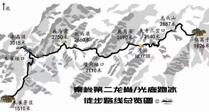 漫沟垭口——鹿角梁——跑马梁——兵马营——冰晶顶——朱雀景区门口出