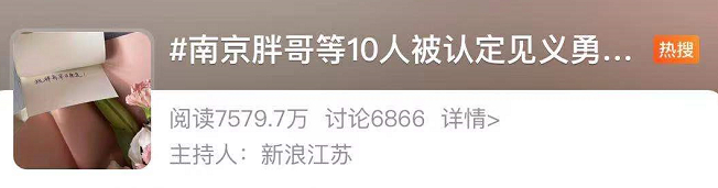 6月2日,“南京胖哥等10人被认定见义勇为”登上热搜。网友纷纷留言:“原来见义勇为的人那么多!”“实至名归,早日康复!”“希望善良的他们都能好好的!”