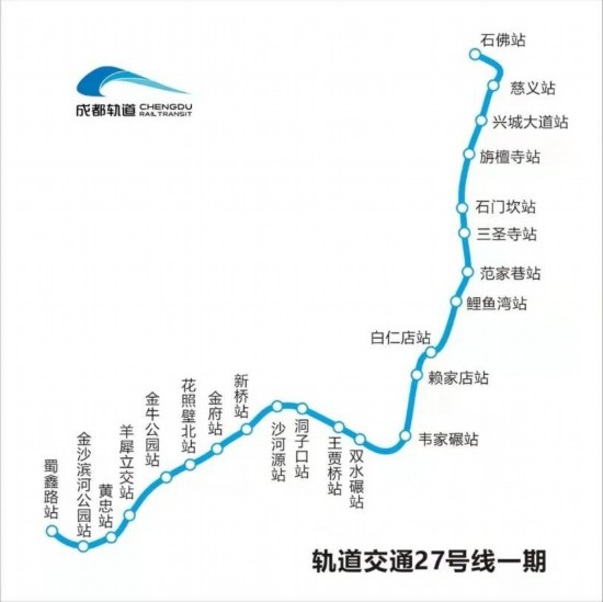 27号线一期起于石佛站,止于蜀鑫路站,全长24.86公里;设车站23座,其中高架站6座,地下站17座。