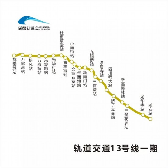13号线一期起于瓦窑滩站,止于龙安站,途经青羊区、武侯区、锦江区、龙泉驿区,工程线路全长约29.07公里,共设车站21座。
