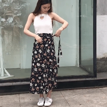 如果觉得裙子长了,可以系得高腰一些,腰线想拉到哪里自己说了算,小个子的女生也能穿出大长腿即时感。