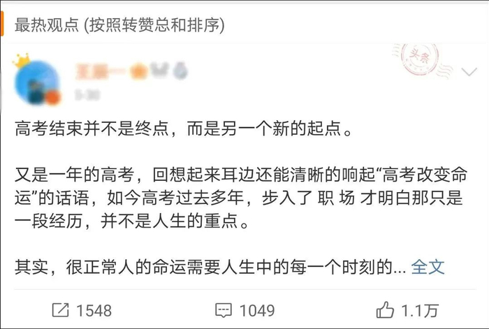 有网友对此总结道:高考结束并不是终点,而是另一个新的起点。正常人的命运需要人生中的每一个时刻的经历,将这些串联起来,才能真正的决定我们一生的命运。