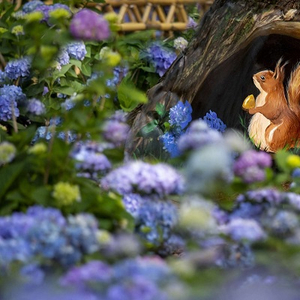 在新八仙花主题园,有一条蜿蜒小径,两侧用竹子作矮篱,乍一看是一个美女坐在蘑菇椅上欣赏八仙花,再一看原来是几可乱真的彩绘。花园中间铺小碎石为路,一只兔子从草丛中探头探脑,啃着萝卜可爱至极。环坡道上远远望去,一位亭亭玉立的少女弯着身子抚摸着“无尽夏”。再走几步,一只小浣熊又从天然树洞里悄悄地探出头来,欣赏着外面的八仙美景。还有一对松鼠在隔空抢松果,透视立体感的松鼠简直就像在树里造了一个窝……