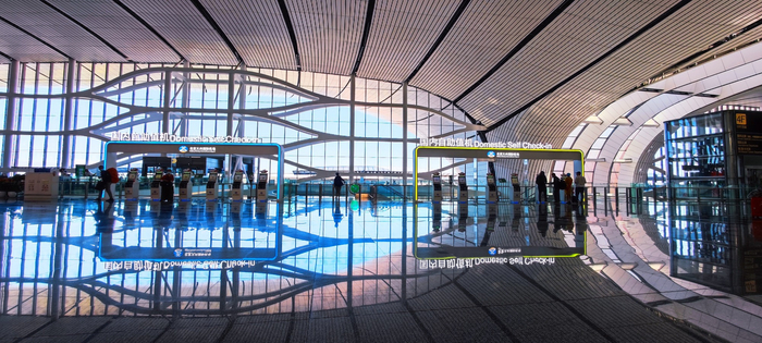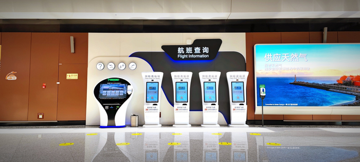 大兴机场航站楼内设置多处自助查询终端、智慧航显等智能设备,由于点位分布较分散,旅客关注度和使用率不高。为此,大兴机场通过化零为整,集中设备资源,优化点位,打造小型信息岛,提供“一站式”服务资讯平台,同时对小型信息岛外观进行整体设计,使旅客更易发现、找寻和使用设备。