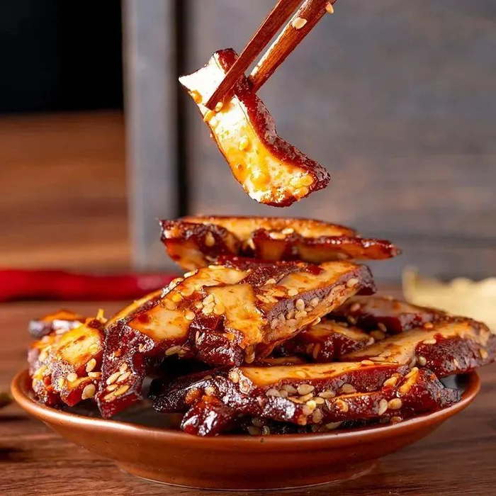 卤好的豆干上撒满了芝麻和辣椒,咬上一口,浓郁的豆香在舌尖跳跃,咸、香、麻、辣,劲道有嚼劲,虽然不是肉,但比肉还好吃 ~