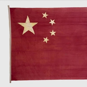 用声音刻录百年记忆,我是革命文物讲述人、中国国家博物馆讲解员王松楠。我要讲述的这件文物,是开国大典时毛泽东主席升起的中华人民共和国第一面国旗。这面国旗长460厘米,高338厘米,是由5幅红绸拼接缝制而成的,5颗黄五角星由黄缎制成。历经数十载,国旗的边角和旗裤已略有残破,旗面也稍有褪色,可它在人们心中却永远鲜艳夺目。