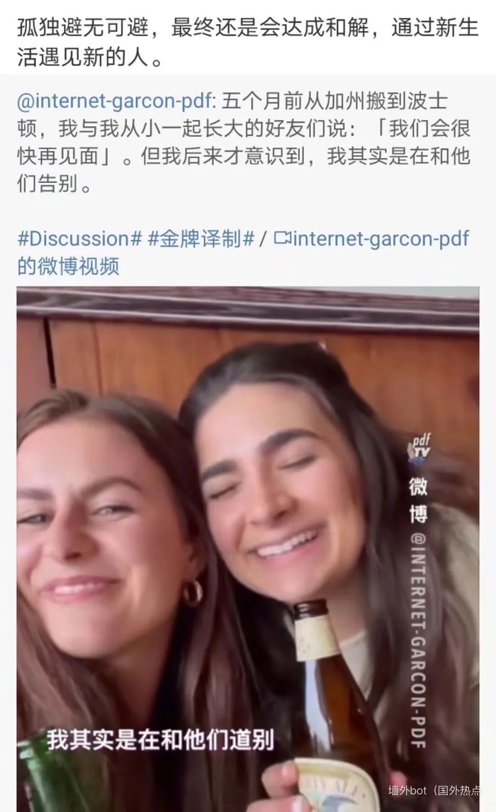 微博上有位外国网友投稿说,“我曾经有段千载难逢的友谊,在我5个月前搬家离开加州时,我和我的朋友们说我会很快再和他们见面。