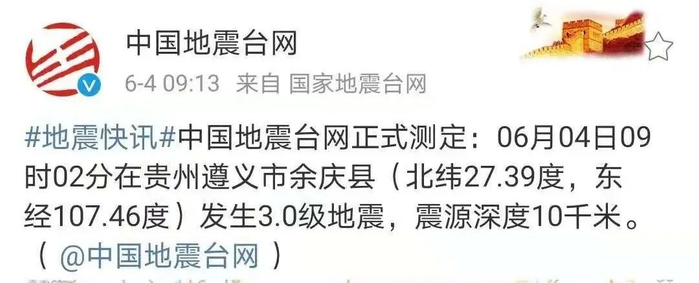 地震快讯:中国地震台网正式测定:06月04日09时02分在贵州遵义市余庆县(北纬27.39度,东经107.46度)发生3.0级地震,震源深度10千米。