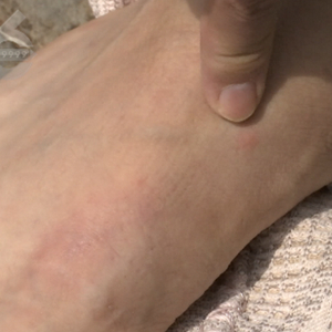 记者发现,已过了一天,但小谭的右脚脚背和小腿上,依然有3个明显的红点。