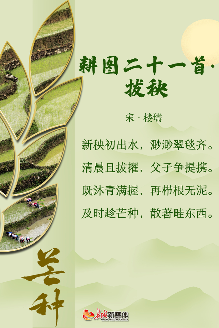 赏析:播种的秧苗出水了,浩渺的像绿颜色的毯子一样整齐。清晨就把秧拔起来,父子争相挑担。那一把青色的秧苗握在手里,及时趁着芒种,丢在田里,就要播种了。这首诗生动再现了农家拔秧苗、准备插秧的景象。秧苗提前播种下去,绿绿青青的秧苗出水后,农家要把秧苗拔起来,再插到田地里,最后在精心维护下,才能长成稻子。所以,真是“粒粒皆辛苦”。