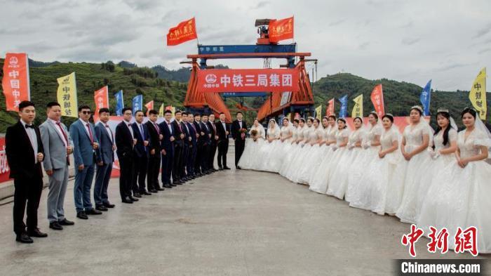 中铁三局五公司各建设工地的17对新人相约宜彝高速公路三标施工现场举办集体婚礼。 中铁三局五公司供图