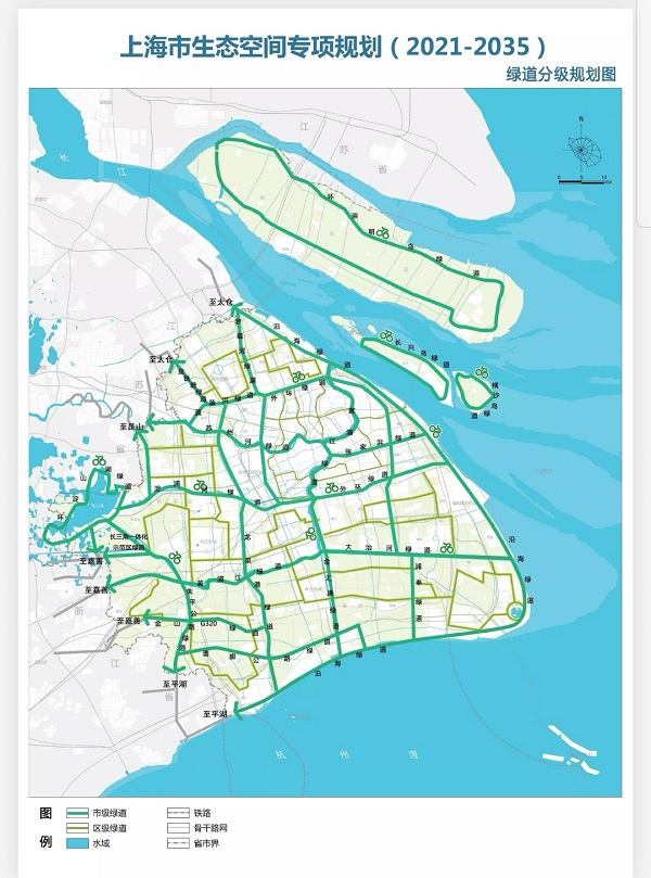 在绿道和廊道两大网络方面,上海到2035年将规划建设2000公里以上的骨干绿道,包括环崇明岛、环淀山湖、沿外环绿带、沿江沿海以及沿黄浦江、苏州河、大治河等重要生态空间的市级绿道。同时将重点推进34条滨水沿路生态廊道建设。