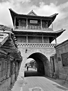 “现在在新平堡还能看到不少具有时代特色的遗址。”在袁建琴的带领下,山西晚报记者一行来到了新平堡最具时代的遗址——玉皇阁。玉皇阁亦名镇边楼,是新平堡最高的建筑,也是新平堡标志性的建筑,更是我国北方现存仅有的一座十字过街阁。玉皇阁是典型的正方形三层两檐歇山顶式楼阁,面阔3间,进深3间。底部为石基砖碹十字形通道,四周是压条砖栏;上层是木制勾栏平座,上下座均有回廊。沿着历史悠久的木质台阶手脚并用爬上玉皇阁的二楼,凭栏远望,新平堡整个村落尽收眼底,古老的房屋,残缺的城墙,苍茫而辽远。