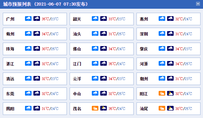 7日—8日,粤东、粤西和珠江三角洲市县多云,有中雷雨局部暴雨或大暴雨,其余市县多云为主,有雷阵雨局部暴雨;最高气温:中北部市县和雷州半岛33~35℃,其余市县30~32℃。