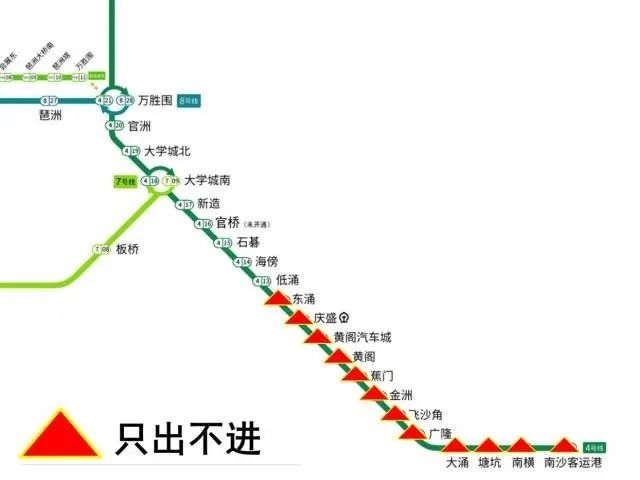 据广州地铁最新通报:6月7日运营时间起,一号线西塱站、坑口站、花地湾站、芳村站,广佛线龙溪站、西塱站、沙涌站,五号线滘口站调整为停止对外运营服务;广佛线仍实行鹤洞站、菊树站停止对外运营服务;四号线“东涌站至南沙客运港站”各站所有出入口只出不进。