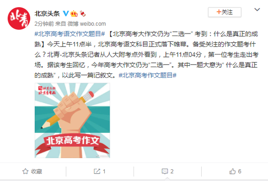 今天上午11点半,北京高考语文科目正式落下帷幕。备受关注的作文题考什么?北青-北京头条记者从人大附考点外看到,上午11点04分,第一位考生走出考场。据该考生回忆,今年高考大作文仍为“二选一”。其中一题大意为“ 什么是真正的成熟”,以此写一篇记叙文。