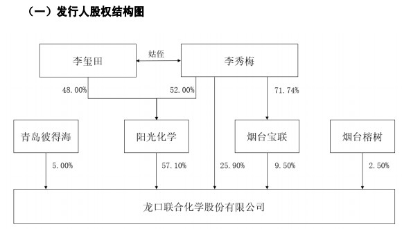 股权结构方面,联合化学持股比例在5%以上的股东共有4家,分别为龙口阳光化学有限公司(以下简称“阳光化学”)、李秀梅、烟台宝联投资中心(有限合伙)、青岛彼得海投资管理咨询有限公司,持股比例分别为57.10%、25.90%、9.50%、5.00%。