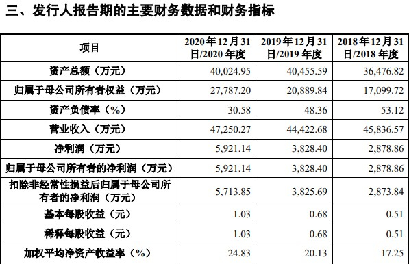 招股说明书指出,联合化学经营方面,营收上,联合化学最近连续3年的营收均超过4亿元。具体来看,2018年至2020年,分别实现营收4.58亿元、4.44亿元、4.73亿元。