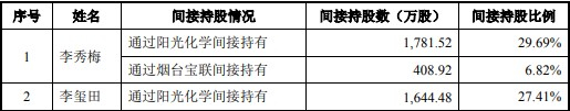 招股说明书显示,李玺田持有阳光化学48%股份,令其间接持有联合化学27.41%的股权,间接持股数为1644.48万股。