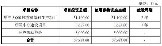 值得关注的是,招股说明书显示,联合化学本次IPO,共拟公开发行股票2000万股。募集资金用途方面,主要为投资年产8000吨有机颜料生产项目,使用募集资金金额3.11亿元。同时,研发中心建设项目和补充流动资金,分别拟使用募集资金金额为3682万元、5000万元。使用募集资金总金额为3.98亿元。