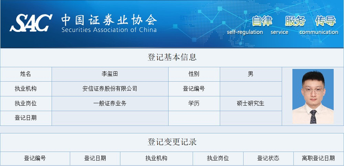中国证券业协会官网显示,李玺田目前执业机构为安信证券,执业岗位为一般证券业务。