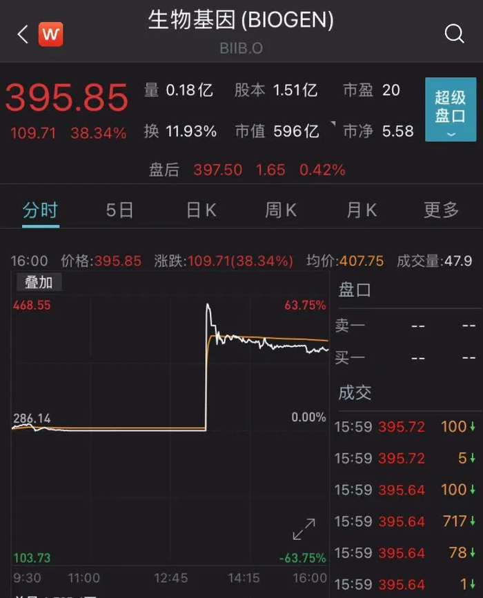 而此次消息传出后,渤健(BIIB.US)股价8日一度暴涨近60%,触发两次熔断,最终收涨38.34%,报395.85美元。